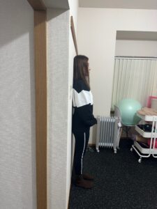 ①壁にお尻・背中・頭をつけて立つ